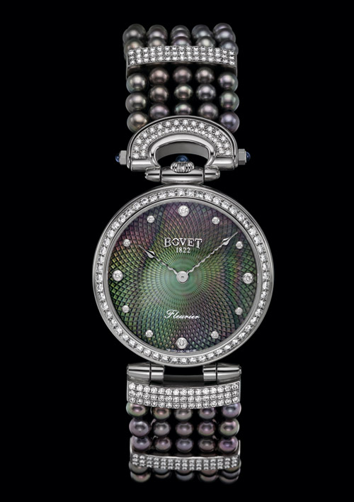 В фирменном корпусе Fleurier Bovet представил уникальные женские модели часов с автоматическим механизмом с перламутровым циферблатом, украшенные жемчужинами, и бриллиантами.